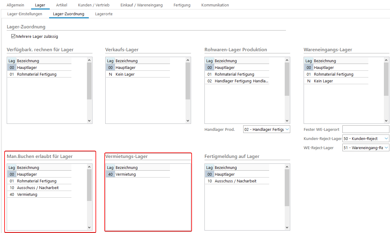 Ist hier keines hinterlegt, werden die bereits eingestellten Lager berücksichtigt.