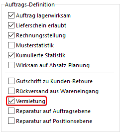 Um der Auftragsart die Vermietung zuzuweisen, muss in der Auftrags-Definition ein Haken bei Vermietung gesetzt werden.