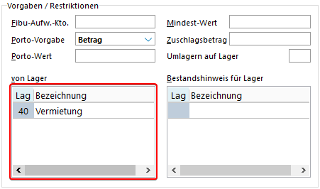 Um ein bestimmtes Lager der Vermietung zuzuweisen, kann das hierfür in den Vorgaben / Restriktionen angegeben werden.