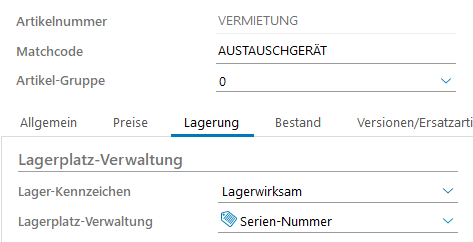 Hierbei sollte lediglich aufgrund von Nachvollziehbarkeit beachtet werden, dass das Feld Lagerplatz-Verwaltung unter Lagerung auf Serien-Nummer steht.