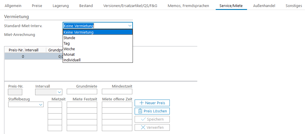 Zudem muss in dem zu vermietenden Artikel unter Service/Miete das Standard-Miet-Intervall eingestellt werden.