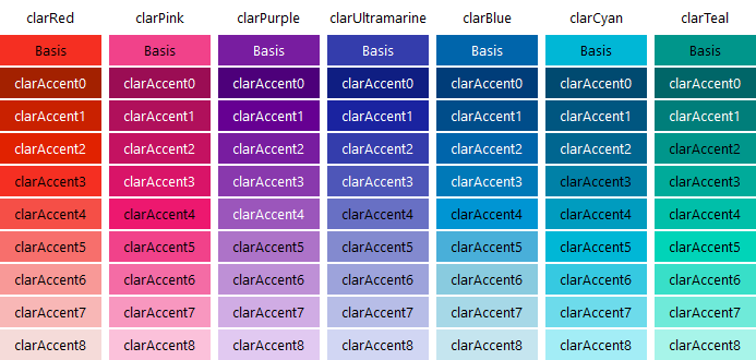 nColor:N | Basisfarbe - Zahlen / Konstanten: 0 / clarRed 1 / clarPink 2 / clarPurple 3 / clarUltramarine 4 / clarBlue 5 / clarCyan 6 / clarTeal 7 / clarGreen 8 / clarYellow 9 / clarOrange 10 / clarRedOrange 11 / clarWarmGrey 12 / clarNeutralGrey 13 / clarCoolGrey |