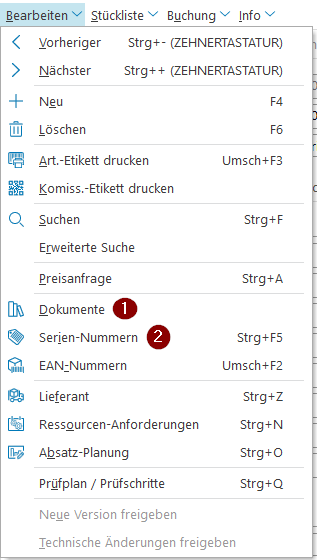 Beispiel: Einbindung in das "Bearbeiten" Menü VOR dem Menüpunkt "Serien-Nummern" (2) für alle Artikelstamm-Masken
