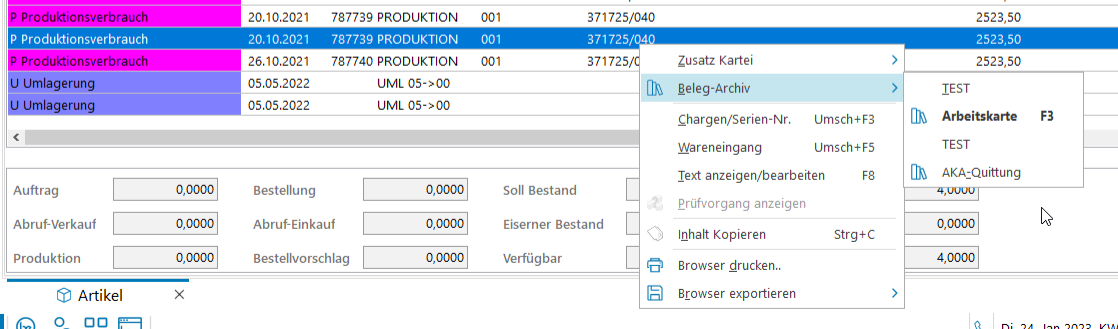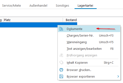 Beispiel 1: Einbindung im Kontextmenü der Lagerkartei:
