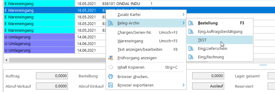 Beispiel 2: Einbindung des Individualmenüs "TEST" im Untermenü "Beleg-Archiv" im Kontextmenü der Lagerkartei, vor dem Menüpunkt "Eing.Lieferschein"