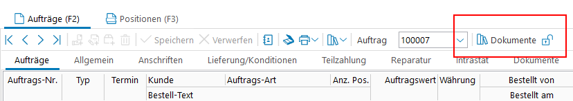 Beispiel 1: Einbindung in der Toolbar der Kundenauftragsverwaltung zwischen der Auftragsnummer und dem (Ent-)Sperr-Button: