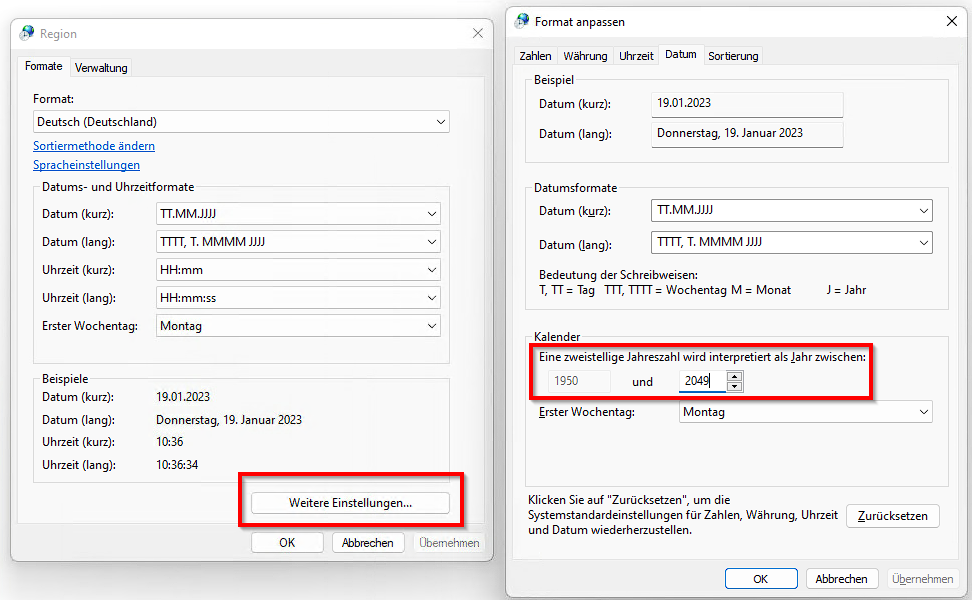 ShowLongYear:L | true: Das lange Datumsformat wird verwendet. (DD.MM.YYYY) Achtung: Bei der Einstellung ShowLongYear = false werden die Jahre anhand von Windows-Einstellungen interpretiert. ![]() |